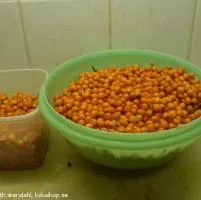 Detta recept är för att visa ett av sätten man kan göra med nyplockade havtorn, här mosas bären i ett durkslag sedan läggs saften i fryskuber och förvaras i frysen.