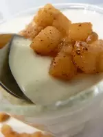 Havtorn- och yoghurtglass med mannagrynspudding och müslitopping. Innehåller bland annat: Mannagryn och Mjölk