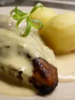 Här är ett bra recept på kycklingfilé med krämig sås, purjolök och hackade valnötter.