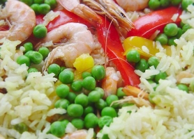 - Skär paprikan i mindre bitar. Tillsätt paprika och kyckling i stekpannan. Häll även i paprikapulver och soja. Blanda och låt steka i ca 10 minuter. Smaka av och tillsätt eventuellt mer curry och salt. Blanda i räkor och det färdigkokta riset. Servera med stekt ägg.
