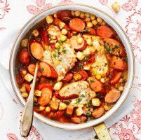 Halstrad torsk i buljong med ärter och chorizo
