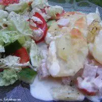 Enkelt och gott recept på en smarrig blandning, servera gratängen med en enklare grönsallad eller annat tillbehör, passar utmärkt att servera vid jul. Innehåller bland annat: Skinka och Timjan