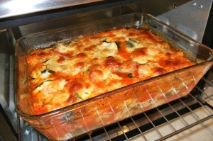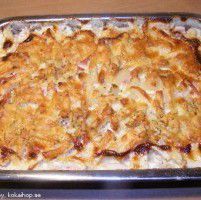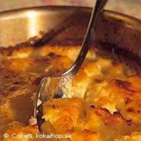 Tips: Om det bildas en alltför brun hinna på ytan kan man lyfta bort denna med en värmetålig stekpincett. Eller kan man täcka ytan med lite aluminiumfolie, när gratängen har fått lagom färg.