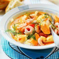 Servera soppan varm tillsammans med nybakat bröd. Innehåller bland annat: Torsk och Laxfilé
