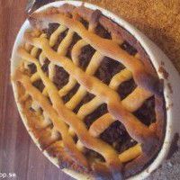 Enkelt och mättande recept på en härlig köttfärspaj, denna pajen passar utmärkt att göra om man har köttfärssås över från gårdagen, i detta receptet används även purjolök för att ge smak åt pajen. Innehåller bland annat: Blandfärs och Vatten